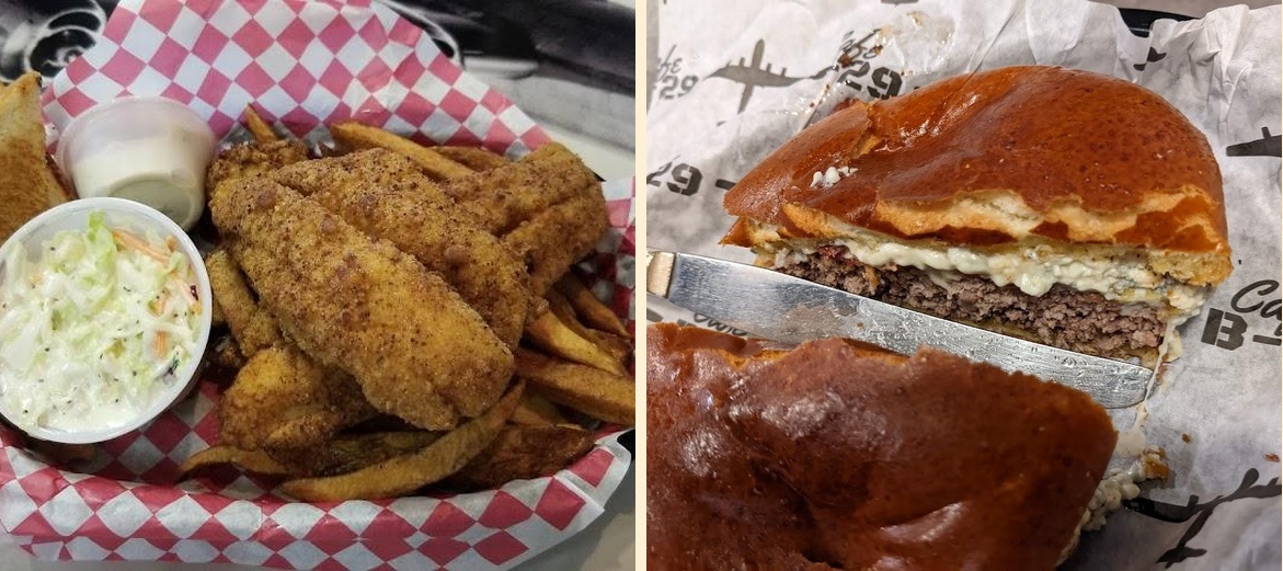 Cafe B-29 offers daily specials like Tuesday's meatloaf and Catfish Thursdays. Don't miss the award-winning Jalapeno Popper Burger and Grandma's Old Fashion Bread Pudding.