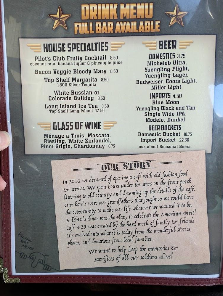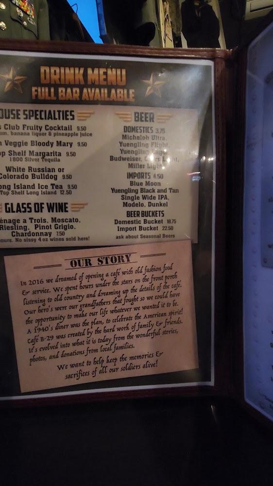 Cafe B-29's menu features a delightful mix of comfort food inspired by home cooking. Signature items like the Jalapeno Popper Burger shine, alongside classic diner options such as Reubens and French Dips. Daily specials add variety, with favorites like meatloaf and catfish. The menu includes salads and appetizers like Fried Pickles and Boneless Wings, perfect for sharing. Desserts are not to be missed, with options like Fried Twinkies and Root Beer Floats. An affordable price range of $10-$20 makes enjoying a meal easy for all. Overall, the menu reflects the heart of the restaurant—comfort and community.